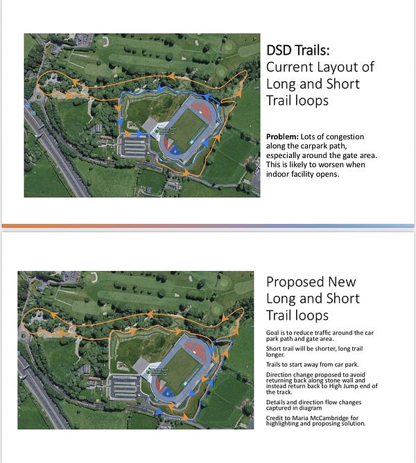 New Long and Short Traio loop from Tuesday 20th January 2926: the aim is to reduce traffic around the carpark path and gate area. Short trail will be shorter, long trail longer. Direction change proposed to avoid returning back along stone wall and instead return back to high jump end of the track. Details and direction flow changes captured in diagram. Many thanks to Maria McCambridge for highlighting and proposing solution.